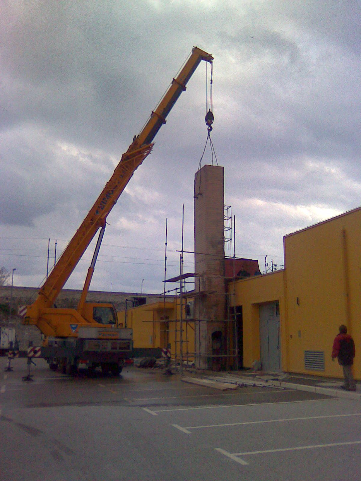 - 2. DAN: Dijamantno rezanje armirano-betonskog dimnjaka -sekcijska demontaža skele – skidanje dijela dimnjaka auto dizalicom te odvoz i deponiranje.